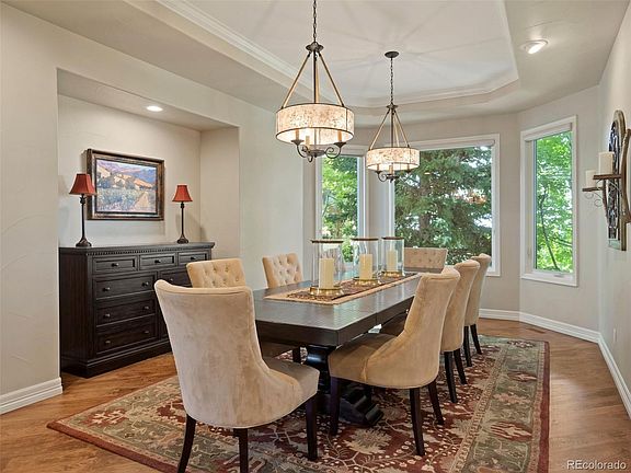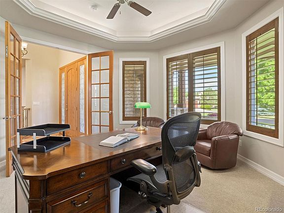 Welcome to your dream home in the exclusive gated community of Daniels Ridge, Castle Pines. This pristine patio home backs onto the 8th Fairway, offering breathtaking golf course views. As you enter, you're greeted by soaring vaulted ceilings and a spacious entryway. The formal dining room, with custom lighting and tray ceilings, is perfect for intimate dinners. A private study with French doors offers versatility as an additional bedroom if needed. The heart of the home is the remodeled kitchen, featuring updated appliances and a large island that seats four. The kitchen flows into the great room, with a sleek linear fireplace and where a wall of windows frame stunning views. Step out onto the expansive composite deck with retractable awnings and enjoy panoramic views, including Pikes Peak. The main floor primary suite is a true retreat with golf course views, a luxurious bath with double sinks, vanities, and shower heads in a glass-enclosed shower. A large soaking tub and a walk-in closet with custom built-ins complete the space. Descend the curved staircase to the walk-out lower level is designed for entertaining, a classic, full bar serves as the focal point connecting the game room, and TV area. Sliding glass doors lead to a covered patio, extending your living space outdoors. The lower level also includes two bedrooms, one with an ensuite bath, and the other with direct access to a full bath. A temperature-controlled wine room, home gym, and generous storage space complete this level. Car enthusiasts will love the three-car garage, featuring a workbench and custom cabinets for ample storage. This low-maintenance community offers lawn mowing and snow shoveling services, so you can focus on enjoying your beautiful home.