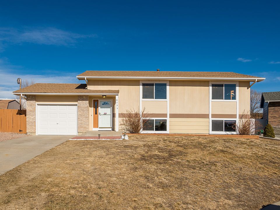 Move in ready home with numerous updates* This bi-level is located conveniently to shopping, restaurants, schools, Fort Carson, and Peterson* Attached 1 car garage* Backyard has a large deck great for entertaining on and a large shed* Whole house has central air perfect for the upcoming summer days* The whole interior has been freshly painted* Upstairs has a living room, Eat in Kitchen with backyard walkout, and 2 bedrooms* The Kitchen/dining nook has ceramic tile flooring, Stainless Steel appliances, and newer countertops* Upper level also has a full bath* Lower level has a large family/rec room* There are 2 more bedrooms and a 3/4 bath*