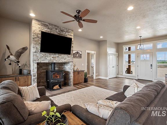 A horse property with views that never seem to end is what you'll find on this 15ac estate tucked away off the main road in Melba,ID. Built in 2018 the home boasts quality finishes throughout with a welcoming open feel in the main living area and large bonus upstairs. The primary suite allows for access to a private patio overlooking the Owyhee Mountains to the south. A large riding arena with room to expand and a round pen gives you the opportunity to keep your favorite horse in shape in any discipline you prefer. The barn features a tack room that allows plenty of storage and a spot for the horses to escape the elements complete with stall mats, automatic waters in each stall and direct access to the 4ac orchard grass pasture. 7 acres of quality alfalfa will produce more than enough to keep your animals fed through the year.