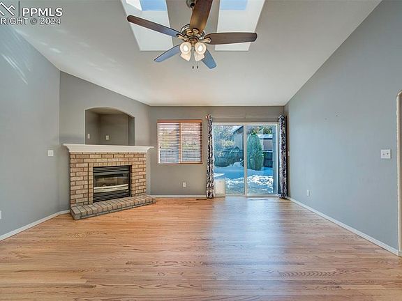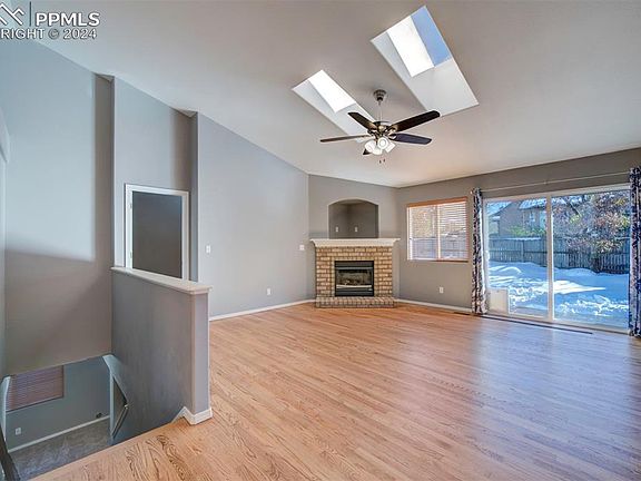 Welcome home to this meticulously -maintained 4 bedroom, 3 car garage, ranch home in New Port Heights. Main level living area has beautifully refinished hardwood floors throughout, new skylights, gas fireplace & a walk out to a newly stamped concrete patio, large yard with automated sprinkler system & an 8x14 tough shed. The kitchen features new stainless steel appliances, ample cabinet space & eat in nook. There is a formal/separate dining room with hardwood flooring and vaulted ceilings. The main level has 2 bedrooms with the primary bedroom featuring, vaulted ceilings, recessed shelving, ceiling fan, and private, remodeled bath with dual vanities. The spacious basement features a large family room, two bedrooms, a full bath & a large laundry room with included washer, dryer & refrigerator plus plenty of storage space. This beautiful home comes with a new hail resistive roof, new skylights, new furnace, new a/c and newer hot water heater. This turn key home with no HOA is close to the Powers corridor, blocks from Cottonwood Creek Park, walking & biking trails, military bases & schools. It is a must-see—don’t miss the chance to make it yours!