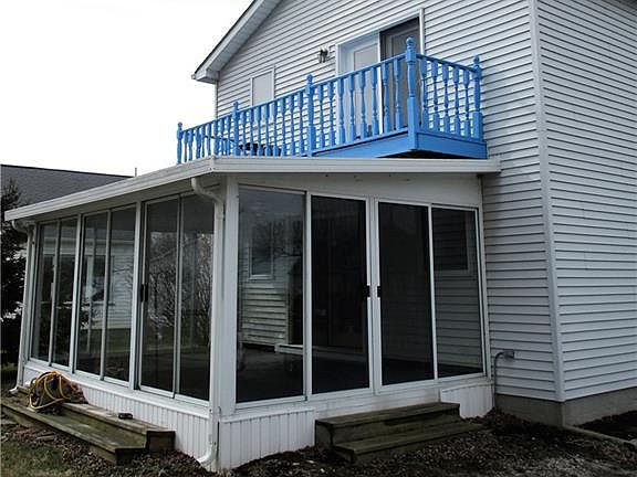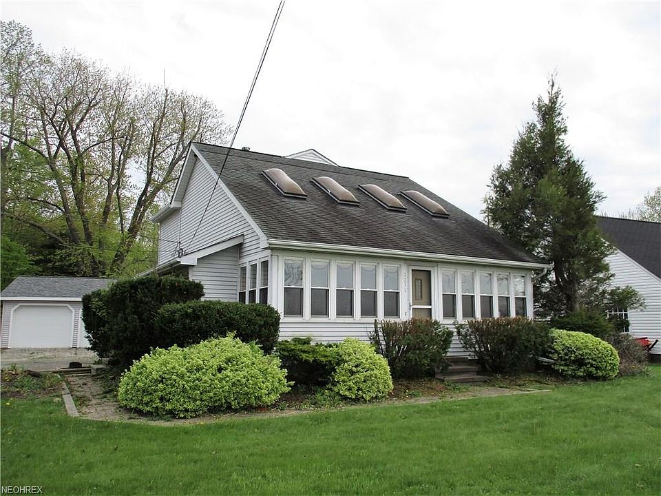 Totally unique home with 2-bedrooms and 2-full baths. Main floor features large kitchen w/ area for dining and center island with gas counter top range, double wall ovens and tons of cupboards. Living room features built-in drawers and views of Lake Erie. Main floor full bath w/ large laundry closet. Up the spiral staircase find an open loft w/ sky lights that have Lake Erie views. Loft has built-in book cases. Master suite has full bath with shower, private balcony with views of the back yard and a 10 x 9 walk in closet with built-in vanity dressing area. 17 x 12 heated patio enclosure off the back is a great place to enjoy some peace and quiet. Newer 24 x 22 detached garage w/ concrete floor and insulated garage doors - built in 2014. 18' strip of land across the street belongs with this parcel. Near large rock - marked with pink stakes. Beautiful unobstructed views of Lake Erie. New stake survey complete and will be recorded with transfer. This one needs a little elbow grease but sure to be a great home and the sweat equity is sure to be yours! 3.5-miles to Geneva Oh The Lake and Lake Erie amenities.