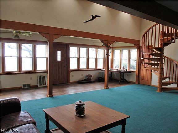 Totally unique home with 2-bedrooms and 2-full baths. Main floor features large kitchen w/ area for dining and center island with gas counter top range, double wall ovens and tons of cupboards. Living room features built-in drawers and views of Lake Erie. Main floor full bath w/ large laundry closet. Up the spiral staircase find an open loft w/ sky lights that have Lake Erie views. Loft has built-in book cases. Master suite has full bath with shower, private balcony with views of the back yard and a 10 x 9 walk in closet with built-in vanity dressing area. 17 x 12 heated patio enclosure off the back is a great place to enjoy some peace and quiet. Newer 24 x 22 detached garage w/ concrete floor and insulated garage doors - built in 2014. 18' strip of land across the street belongs with this parcel. Near large rock - marked with pink stakes. Beautiful unobstructed views of Lake Erie. New stake survey complete and will be recorded with transfer. This one needs a little elbo
