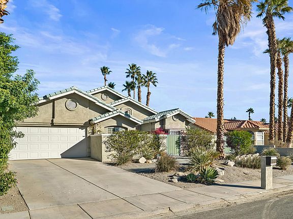 Welcome to your dream home in Rio Vista, a charming suburban neighborhood in Cathedral City! This stunning property is just 5 minutes from Palm Springs and minutes to downtown Cathedral City's Aqua Caliente Casino, restaurants, shopping, and nightlife. This sophisticated 4 bedroom plus den/office, 2 bath home offers a generous 2330 square feet of living space with a layout designed to maximize comfort and versatility and the entire property is gated ensuring privacy and peace of mind. Upon entering, you're welcomed by an inviting foyer that leads into the light-filled open concept Great Room. Tray ceilings and polished ceramic tile floors add a touch of elegance to the space, while a corner fireplace provides warmth and ambiance. The large kitchen is a chef's dream with stainless steel appliances, a double oven, abundant cabinet, pantry, and counter space, and a dining bar and breakfast bay. A gracious foyer leads to spacious bedrooms where closet space abounds. The primary suite is a true retreat, boasting two walk-in closets and an oversized bathroom with double vanity sinks, a large soaking tub, and a separate double shower. Step outside from the living room or primary suite onto the expansive covered lanai complete with an outdoor kitchen, built-in barbecue, dining bar, and a stunning backyard pool and spa.The property also includes a side yard that can accommodate RV parking and a separate laundry room leading to a large two-car garage. NO HOA fees and you own the land.