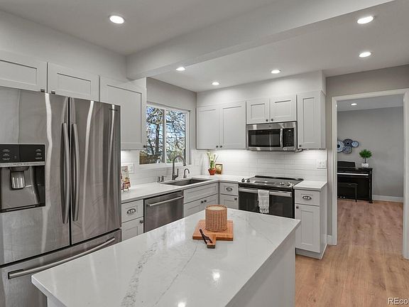 Kitchen: The kitchen has been remodeled and now boasts new white cabinetry, stainless steel appliances, and quartz countertops.