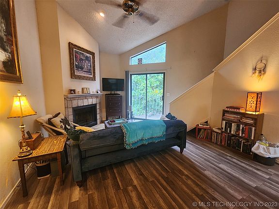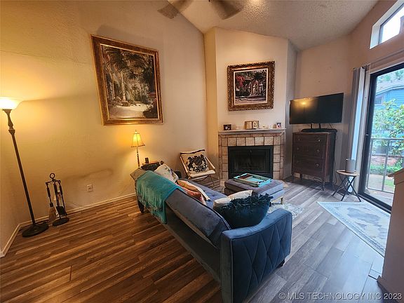 South Tulsa Condo, 2 Bedroom ~ 2 Bath. Spacious living with vaulted ceilings, wood burning fireplace and open to the kitchen with plenty of cabinets and a lrg pantry. The Master can be on the 1st or 2nd floor. They both have access to a full bath and the room upstairs is huge and overlooks the vaulted living room. There is also a balcony and storage room. Complex has a nice pool available that just around the corner from this condo. This South Tulsa location puts you within 5 min to River Spirit or Jenks Riverwalk, 10 min to the Gathering Place and walking distance to Riverside walking & biking trails.