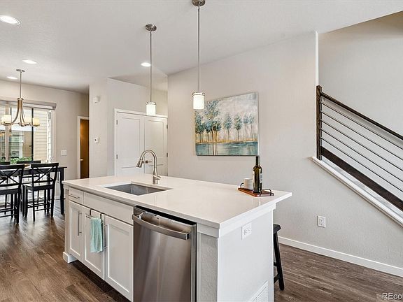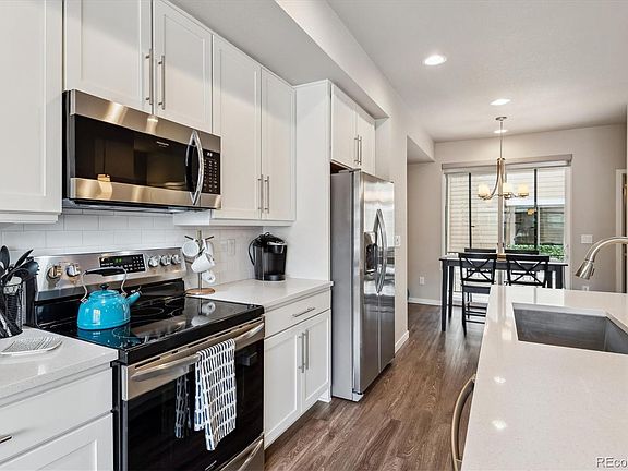 Welcome home to this turn-key contemporary townhome in sought-after Saddle Rock, which provides premiere access to an active lifestyle with easy access to all Southlands has to offer. Over $22k in builder upgrades including LVT flooring, high ceilings, premium carpet, a well-appointed kitchen, and quartz counters throughout. The spacious main floor is ideal for entertaining and the sliding glass door off the dining area leads to a large covered balcony. Enjoy your morning cup of coffee or dine al fresco throughout the warm summer months. The kitchen features white cabinetry with nickel hardware and lower pull-out shelves, an oversized center island, a pantry, and Frigidaire appliances. The upper level offers private living quarters where you are welcomed by two bedrooms, both complete with ensuite bathrooms. Upstairs laundry adds to the floor plan's convenience (washer & dryer included). Additional features of this residence include an attached 2-car tandem garage with bonus storage, upgraded trim and interior doors, smart home technology and security system, custom window coverings, and a water softener. Ideally located within minutes of Saddle Rock Golf Course, Cherry Creek schools, endless shopping and dining options in the Southlands Shopping District, and easy access to E470, this is true contemporary living. Do not hesitate to book your showing today!
