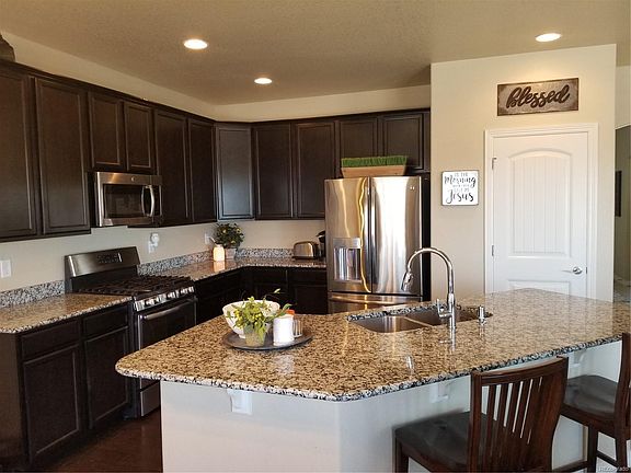 PRICED TO SELL! Stunning like-new home offering over 3,000 sq ft! This charming east facing 2 story resides on one of the largest corner lots within the quiet carriage hills communiity. Substantial kitchen boasts an oversized island and is open to the dining and living areas. Lovely master suite includes a private 5 piece bath. The fully finished basement is a perfect mother in law suite, that has a complete kitchen, is a walkout to a huge yard professianal landscaping , RV PARKING with a 20 foot sliding gate, and garden area. This smart home also has the latest technology with adt home alarm system with multipe cameras and 2 year year paid for subscription This commuter friendly development is I-25 accessible and just moments from a nearby rec center and pool, gymnastics center, local schools, and the main strips shops and restaurants !