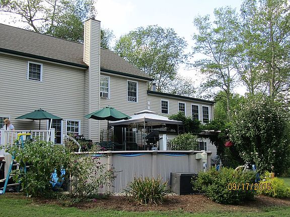 Stunning home with unique features that shouldn't be missed. Open concept kitchen/dining has double ovens, under cabinet lighting and an expandable center island with bar sink. Beautiful hardwood floors throughout main level includes a living room with built in hutch and wet bar, half bath and family room. Dual master suites- one has a huge walk in closet and attached bath with a Jacuzzi tub! The other has 3 closets and an attached bath! Step through a set of French doors that lead to a bedroom, full bath and den with a fireplace and custom mantle, it's own private entrance -what could be a guest suite or in-law apartment. Full basement with radiant heat floors allows for ample storage. Three sliders lead to a 60 ft multi-level deck which extends to a swimming pool, and overlooks a level yard with gorgeous landscaping and a 1600 sq ft rustic barn. There's a 2800 sq ft, detached 6+ car heated garage/workshop with office and half bath. New England stone walls surround the beautifully maintained home- perfect for nature lovers looking for privacy, yet conveniently located.
