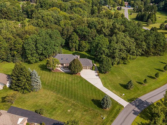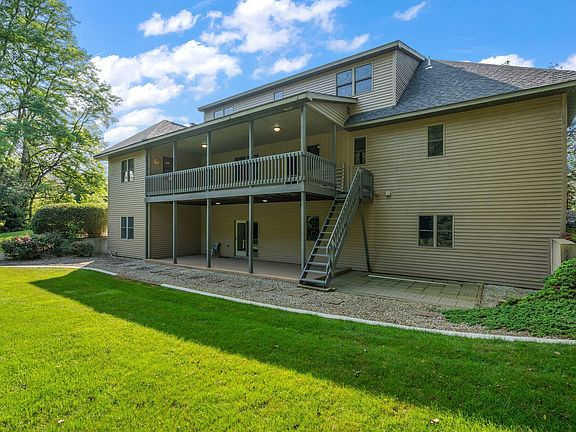 Welcome to luxury living in the exclusive Harvest Estates Subdivision! This stunning two-story home w/ walkout basement, nestled on a 3.4-acre lot, offers privacy & elegance w/ nearly 6,000 square feet of living space. Step inside the foyer, where 9-foot ceilings set the tone for the main level. The living room features a gas fireplace connecting to the formal dining --perfect for gatherings. The gourmet kitchen is a chef's dream, boasting quartz counters, stainless steel appliances, spacious walk-in pantry, and island w/ seating. A custom-built desk adds functional workspace, while direct access to the expansive upper deck makes outdoor dining a breeze. The main floor office w/ deck access, provides a serene spot for work. The main floor primary is a true retreat, complete w/ en-suite bath featuring double vanity, separate shower, whirlpool tub, & oversized walk-in closet. An additional main floor bedroom includes washer & dryer, along w/ a second bath. Upstairs discover two generously sized rooms, each with its own vanity, connected by a Jack and Jill bathroom--ideal for guests. The walkout basement is an entertainer's paradise, offering a bonus family room w/ gas fireplace, possible media room & additional room perfect for a gym. A full bath and ample storage space add to the functionality of this lower level, while the 10-foot poured concrete walls ensure durability. Step outside and enjoy the tranquility of the wooded lot from the expansive two-story deck. Updates include a new roof/skylights installed in 2024, replaced air conditioner compressor, fresh exterior paint, and new well pump. Oversized 3-car garage & additional backyard shed offer more storage. Property has a drainage system that eliminates need for sump pump, interior & exterior tile around home's perimeter ensure water is naturally directed away. Also included: laundry main/upper level, central vac system, water purification system & direct adjacency to the 474-acre Moraine Nature Preserve.