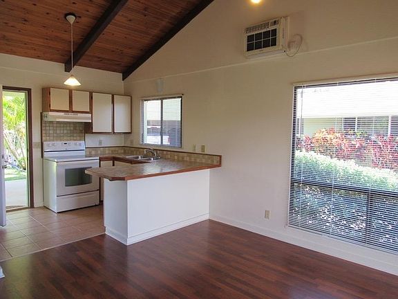 This newly refurbished, well-designed and maintained two-bedroom, one-bath cottage on a cul-de-sac in Maui Uplands is within easy reach of Makawao town, Pukalani, and the Haleakala Highway. The subdivision has an active Home Owners Association and amenities include use of the neighborhood community pool and tennis court (for a fee to the Association). Close to schools and shopping. Vaulted ceilings in living room and kitchen, tiled counters in kitchen with plenty of cabinet space. Air-conditioning in the living room. Laminated wood flooring with tile in kitchen and bath. Carpets in bedroom. Washer and dryer are tucked away in the laundry closet in the carport. Small lanai in the back has good views of Haleakala mountain. Lawn and yard plantings are well-maintained and overlooks the gulch. Lease is six months to start, renewable indefinitely. Owner pays for water, yard service and trash. Tenant is responsible for utilities. Parking is limited and tenants are asked not to block the shared driveway or park on the grass. No smoking, no pets. Not HUD-approved.