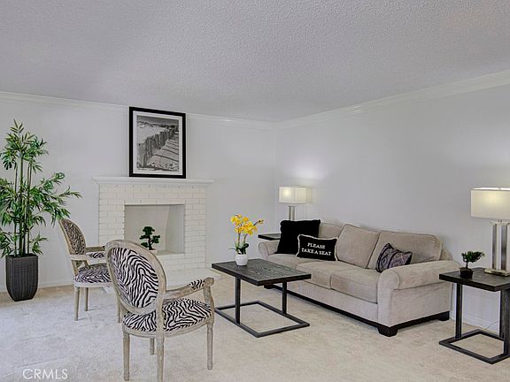 Ground floor Castilla Model - 9 easy riser steps down to enter this spacious, nicely maintained property. Freshly painted in neutral tone. Nice neutral carpet has just been cleaned. This is an end unit with a patio that wraps around the side of the building. Most of the patio has been enclosed to offer even more living space that is not reflected in the square footage of the listing. It's a perfect place for a hobby room, computer room or just for relaxing while enjoying the greenbelt view. The living room has a wood burning fireplace. There is crown molding throughout that adds a touch of elegance. The primary bedroom features lots of closets and dressing area. The second bedroom is spacious and has lots of closet space as well. Located on a nice greenbelt with mature trees & shrubs. Nestled on a cul de sac in the ACTIVE 55+ adult community, award-winning senior community of Laguna Woods Village near Laguna Beach. HOA amenities include- 9 hole Executive & 27 hole Golf Courses-7 clubhouses-3 gyms-5 swimming pools-tennis-stables-fare free bus service-equestrian & golf cart trails-HOA includes water, sewer, trash, basic cable (100+ channels).
