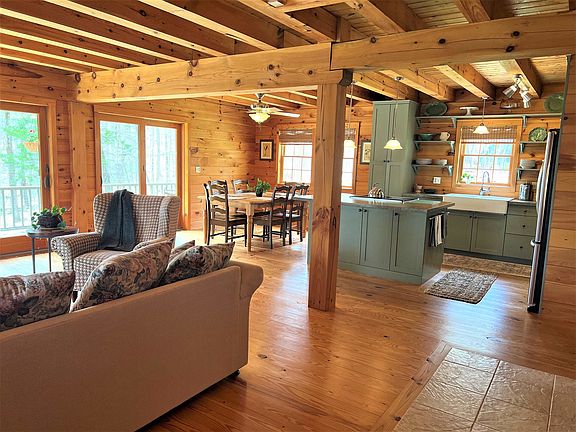 This beautiful log home is in the perfect end of the road location for an outdoorsman and is in immaculate condition. This home has been cared for with tremendous attention to detail and has many features including an amazing wrap around porch, plenty of privacy, wonderful woodwork, a partially finished basement, a metal roof that is in fantastic condition and much more! The very nice pine floor is lined with radiant heat to help fight the Vermont winters but also has baseboard heating and a wood stove. The kitchen features all custom maple cabinets and newer appliances. The open concept floor plan is perfect for hosting friends or family with plenty of space for sleeping on the second floor in the primary bedroom with a bathroom, the two bedrooms on the first floor that are generously sized or the massive loft area perpendicular to the primary bedroom. This home offers a fantastic opportunity to getaway from the every day hustle and bustle and enjoy peace and quiet. Snowmobiles do have direct access to the vast trail system, many other hiking and walking trails can be completed from the property as well.