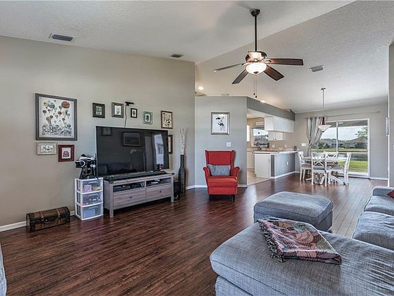 Welcome home! Warm inviting 3 bedroom 2 bathroom home in the River's Edge subdivision now available. This is a must see home in a quiet, well-maintained neighborhood with low HOA fees and a community playground. It is conveniently located near great schools and a variety of shopping and dining. The split floor plan home offers a two-car garage, updated appliances, and a roomy screen-in lanai with a serene lake view. Indoor and garage laundry hook-ups provide versatility for the homeowner. Vaulted ceilings and beautiful flooring complete this move-in ready gem.