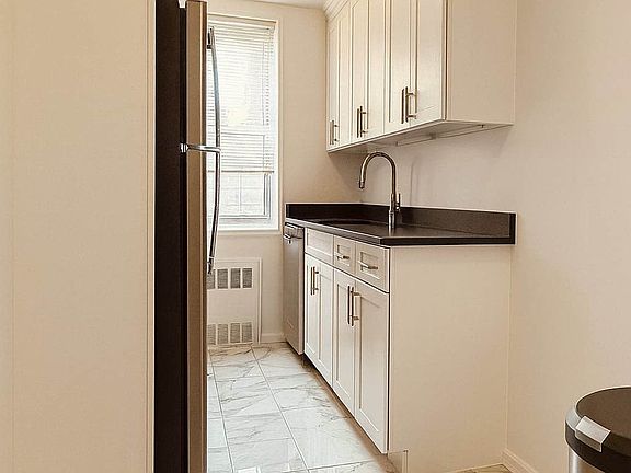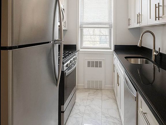 The renovated stainless steel windowed kitchen is equipped with all essential appliances, including a dishwasher and microwave. Ample cabinetry, a classy glass backsplash, and absolute black granite counters contribute to the apartment's sleek aesthetic.