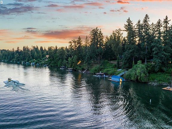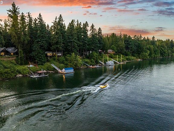 Stunning Willamette Riverfront retreat nestled in coveted River Estates Neighborhood, this epic one level custom home offers a picturesque serene lifestyle. Situated on 1.31 acres of waterfront, enjoy your own private dock & boat house plus full tennis court for pickle ball/tennis/bball! The interior showcases a harmonious fusion of traditional Asian and contemporary elements with the floor-to-ceiling stone fireplace taking center stage. The living/dining areas exude a sense of calm and quietude, providing the ideal space for relaxation and rejuvenation.The U-shaped custom design provides privacy and functionality with two distinct wings and a central connection point in the great room/kitchen area. The primary wing features a beautiful suite with ample closet space and updated bath, plus a library with rich built ins, all with breathtaking views of the Willamette River. The two-bedroom, two-bath wing includes a bonus room off each bedroom entry, perfect for accommodating the whole crew. There is an additional full bath for visiting guests! Outside, engage in friendly matches on the multi-sport court, which accommodates tennis, pickleball, and basketball enthusiasts. A matching auxiliary structure houses the well and offers ample storage or the potential to be transformed into a small guest space, adding versatility to the property. Attention to detail is evident throughout this retreat home. The front door is crafted by renowned artist Leroy Setziol. The original design for the entrance garden was created by landscape architect Robert Murase, known for his work on the Wilsonville Memorial Park. These artistic elements create a warm and inviting atmosphere directly from rich local history. Escape from the hustle and bustle of city life and embrace a River lifestyle where wide-open views of the Willamette River serve as your daily backdrop, discover the charm and allure of this serene oasis! Welcome Home!