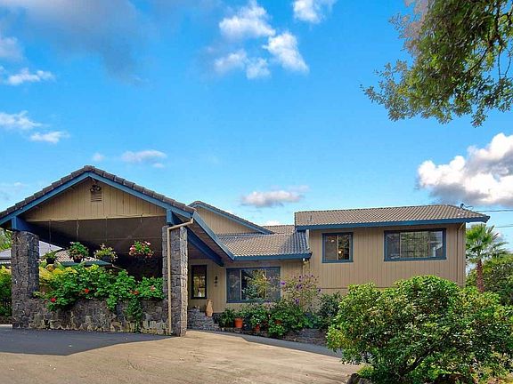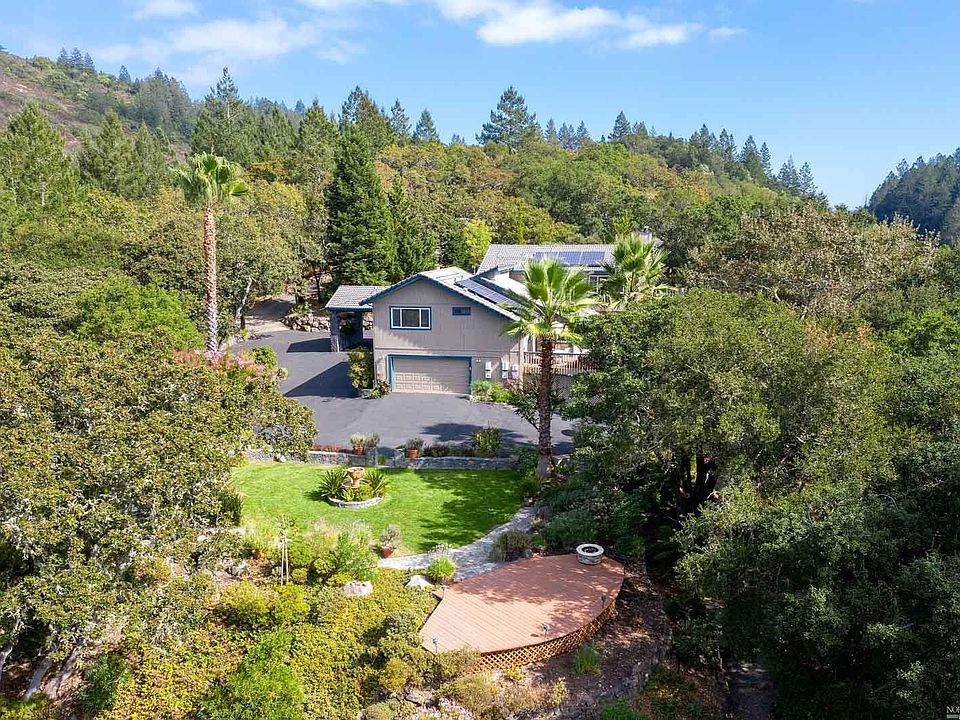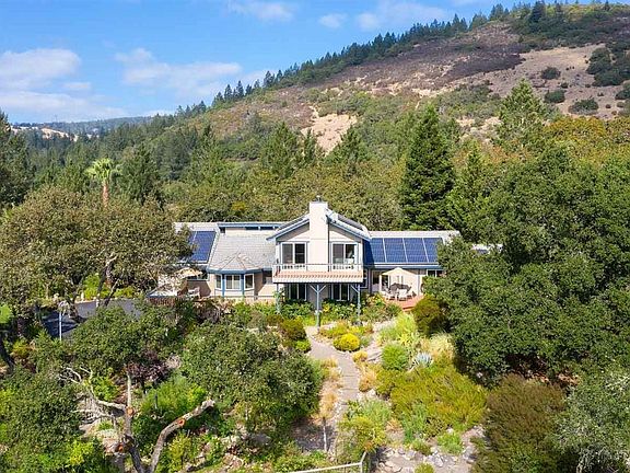 Serene hillside oasis in a coveted location off Los Alamos Rd soothes the soul...This gracious meticulously maintained 3753 sf 5 bedroom estate is a symphony of indoor outdoor spaces, architectural drama & light. Rooms have excellent flow & seamlessly integrate the interior with a breath-taking natural landscape. Rock-lined waterfall, Koi pond, pathways, patios, gardens, & 12 acres of native forest embracing the home, a property of rare privacy & beauty. Decks bordered by mature oaks, other gorgeous trees & plants open to spectacular views. Plentiful sun allows wildlife & plants to thrive. Snuggle up to the wood stove or enjoy sunsets off deck to enjoy wine country at its best. The versatility of this property continues with impressive updates including: Solar panel array, parking 10+ cars, courtyard with circular driveway, porte-cochere. 2 sheds & a pile of firewood to get you through the winter. Potential for vacation rental, granny unit, family compound & room for pool.