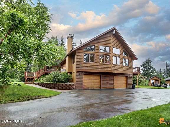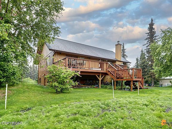 Verdant hillside setting with 1.25 acres of beautiful rolling lawn, mature trees, Mt views & a sturdy barn for your horses too. The home features a greatroom floor plan with an open kitchen with stainless appliances, pantry, and a breakfast bar that seats 6! The living area has towering ceilings, a fireplace, and a wall of windows to bring in the light.Two decks and sunny southern exposure too.The main floor master bedroom features double doors to the south-facing deck, private bathroom, plenty of closet space & extra storage too. There is a guest bathroom in the hall with a bonus shower. There are 2 additional bedrooms and full bath on the lower level, and a hall with closet that leads to the attached and heated 720sqft(!) heated garage which has two doors, a wash-up sink, and a work bench. Walk the grounds of this wonderful property and you'll find a unique 14x20 storage garage with roll-up doors on each end (for maximum use and access.) There's also a 10X12 smoke shed with a professional grade meat and wild game smoker, aside it is another professional grade fish smoker too! For the horse enthusiast there is a well-built 2 stall barn (could easily convert to 3 stalls) with a heated tack room, and large double overhangs designed for hay storage and weather protection for your 4-legged friends. This property has a long and wide paved circular drive with an extra parking area for that full-sized horse transporter---and extra space adjacent to the corral area for all your big toys too. Leafy green privacy, fresh air, sunshine, and the rising harvest moon over the Chugach Mountain Range all await you in this mid hillside horse and animal lovers retreat.