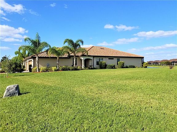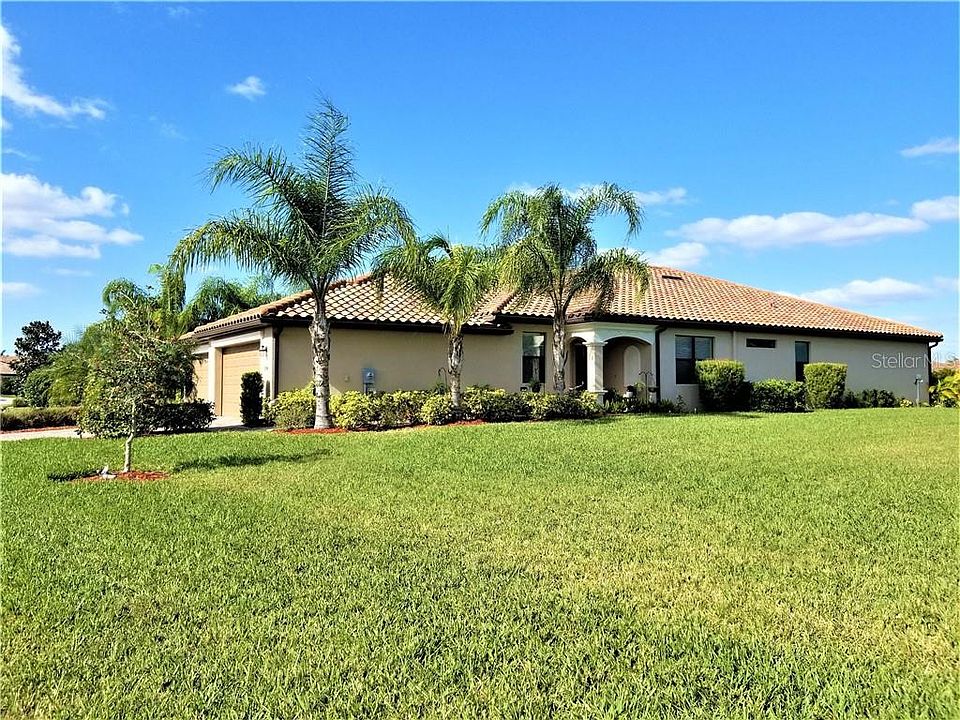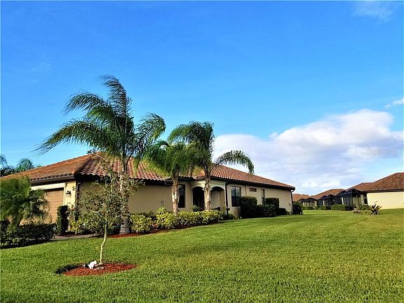 GORGEOUS open floor plan in lovely RIVER STRAND with fabulous LAKE VIEWS! Almost NEW maintenance free 2 bedroom plus den single story villa is spacious and private on one of the largest lots in the villas. Tucked away in the RESORT STYLE community of River Strand which offers a social membership at River Strand Golf & Country Club and all of the resort amenities. River Strand is a friendly community with a 27-hole Arthur Hills designed golf course, 9 Har-Tru Tennis Courts, 8 Pickleball courts, 2 Resort pools, 6 satellite pools, Clubhouse with restaurant, social events, Community Center & 2 Fitness Centers in this LUXURY GATED community w/ 24 hour security & lawn maintenance. This ORCHID model is elegant with 18" ceramic tiles through out the living spaces set on the diagonal and cozy carpet in the bedrooms and den. Pavers on driveway, walkway to entry, covered front porch and screened extended back porch. Chefs kitchen offers granite counter tops, breakfast bar, stainless steel appliances, stone back splash, extra can lights & under cabinet lighting. Master suite has slider to the lanai, lake views,2 closets, walk in shower, dual sinks, garden tub & closets unlimited in walk in. The den/3rd bedroom includes glass French doors and gives you extra space for visitors. Upgraded bathrooms with granite counters and wood cabinetry. Extra insulation added to garage and house helping to keep utility fees super low. Great room and dining room are open and have lovely views to lanai and lake. RESORT LIFE!