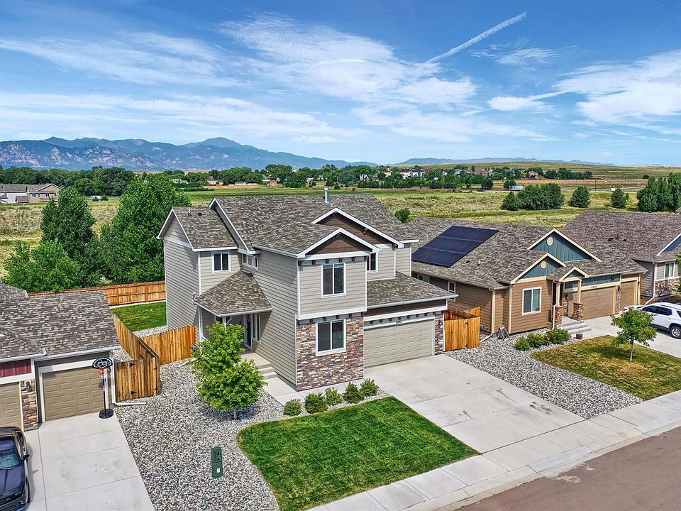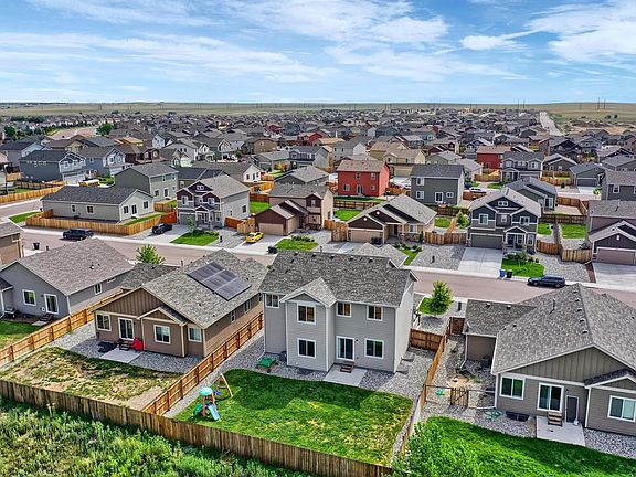 Impeccably maintained, like new 5 bedroom, 3.5 bath in Lorson Ranch. Great location backs open space/creek, private gate access to the walking trail, and mountain views throughout! Thoughtful floor plan offers shared living spaces on every level. Main level features an open and bright kitchen, living room, and dining room with walk-out to the backyard. The true Chef's kitchen has a large island and breakfast bar, granite counters, designer glass tile backsplash, stainless steel GE appliances with gas range, and pantry. Main level is completed by the bright office and a convenient half bath. Welcoming upper level has a flexible loft space to make your own. Spacious master suite boasts a double-sided gas fireplace to enjoy in the sitting area or attached 5pc bath with soaking tub and walk-in closet. A beautiful retreat to enjoy Pikes Peak and open space views. Upper level has an additional 3 bedrooms, full bath, and oversized laundry room with utility sink.