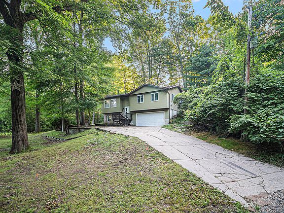 Beautifully updated Cedar Springs home! Sitting on almost 5 acres, this 3 bedroom, 2 full bath bi-level home has been completely renovated. Some of the many renovations include new roof, new water heater, new main water line, new drywall, new appliances, remodeled kitchen, remodeled bathrooms, new carpet, new paint throughout, new doors, new hardware, and new lighting. The home feels quite private sitting on a wooded lot. The main floor features the living room with wood burning fireplace that flows right into the eating area and kitchen. There is a slider to the upper level of the refinished 2 tiered deck. The main floor also features the primary bedroom with attached bathroom, 2 more bedrooms, and the 2nd full bath. The lower level has a finished rec room, some storage, and access to the attached 2 car garage. The private backyard contains a firepit and storage shed. This is a great home ready for new owners and includes a home warranty for peace of mind!