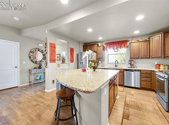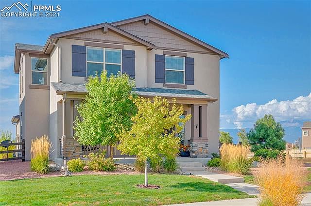 PIKES PEAK VIEWS!!! Delightful, open and bright home in a quiet neighborhood* Spacious kitchen with huge granite island and counters with stainless appliances* Walk in pantry* Slide out drawers in lower kitchen cabinets* Attractive and easy care wood laminate flooring* Breakfast bar and dining area* Pikes Peak views from the living room, Master bedroom, Master bath and covered patio! Large Master bedroom with adjoining private bath* Huge shower in the Master bath and double vanity* Walk-in closet* Upper level laundry room (where the laundry comes from!!!)* 2 car attached garage with opener* Fenced yard (sprinkler system under the xeriscape in back if someone wants grass) * Corner lot* Covered front porch* 3 bedrooms and 2.5 baths and 2 car garage* Stucco exterior* Storage racks in the garage* Gas fire pit, chairs and rug on patio included* Self reeling hose storage* Outside storage bin* Washer, Dryer and refrigerator included* A GREAT HOME IN A GREAT AREA! Must see...it won't last long!