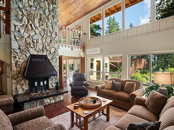 Nestled on five picturesque acres, this custom cedar home offers a serene retreat surrounded by natural splendor. The residence features a tastefully updated kitchen with elegant granite countertops and sleek stainless steel appliances, seamlessly blending modern convenience with rustic charm. Gleaming hardwood floors flow throughout the main level, while expansive windows frame stunning valley views, flooding the space with natural light. The living area is anchored by a dramatic floor-to-ceiling stone fireplace, adding a touch of sophistication and warmth. Cedar-lined ceilings enhance the home’s cozy, inviting atmosphere. Outside, the tranquil ambiance is further enriched by beautiful water features that harmonize with the lush landscape, creating a peaceful haven where every detail has been thoughtfully designed for ultimate comfort and style.