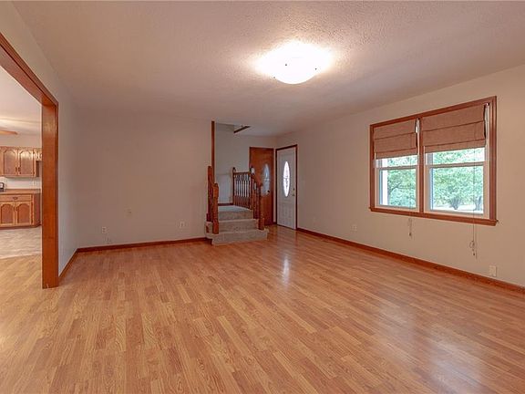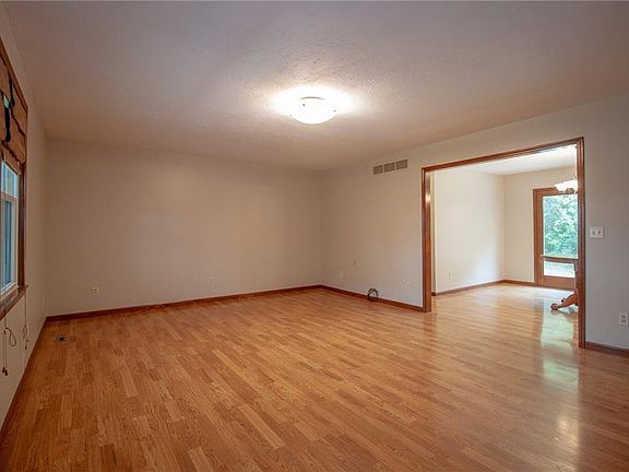 Pretty setting on 3 acres and only a minute or two to I-35 Hwy at Holt. Sellers have just touched this one up and have new carpet, roof, paint, soaking tub in primary bath, landscape and much more. 1 1/2 story plan with big covered front porch. This home offers main floor living with no steps to laundry or primary bedroom. Spacious kitchen and dining area with plenty of cabinets. Addition al 2 bedrooms and office area upstairs. Finished rec room in walkout basement. Two car oversized attached garage, 1 car built in garage and 24x36 detached garage/shop that is insulated and has water and heat.