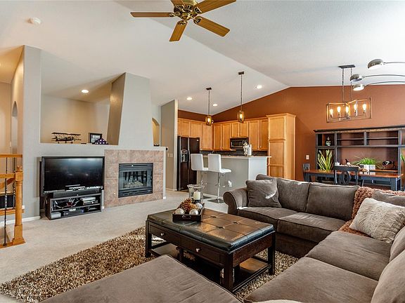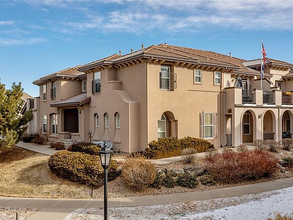 This immaculate and spacious condo has great updates, natural light and vaulted ceiling and is move-in ready condition. With all bathrooms, bedrooms and living space on the 2nd floor this unit lives on one level. The main living area lives as a great room and has an open feel with vaulted ceilings, gas fireplace and built-in bookshelves. The updated kitchen with maple cabinets has slab granite counter tops, tile backsplash, tile floors and cool light features. The master bedroom has great space with an outdoor balcony, ensuite full bathroom and walk-in closet. A breakfast nook, dining area, 2nd bedroom, full bathroom and outdoor balcony complete this magnificent unit. The ground level features front entry way, laundry room, access to large tandem garage and storage area. Prairie Ridge at Saddle Rock is located near E-470 and Southlands and an easy commute to Denver International Airport, DTC, Inverness and many destinations in the Denver metro area.