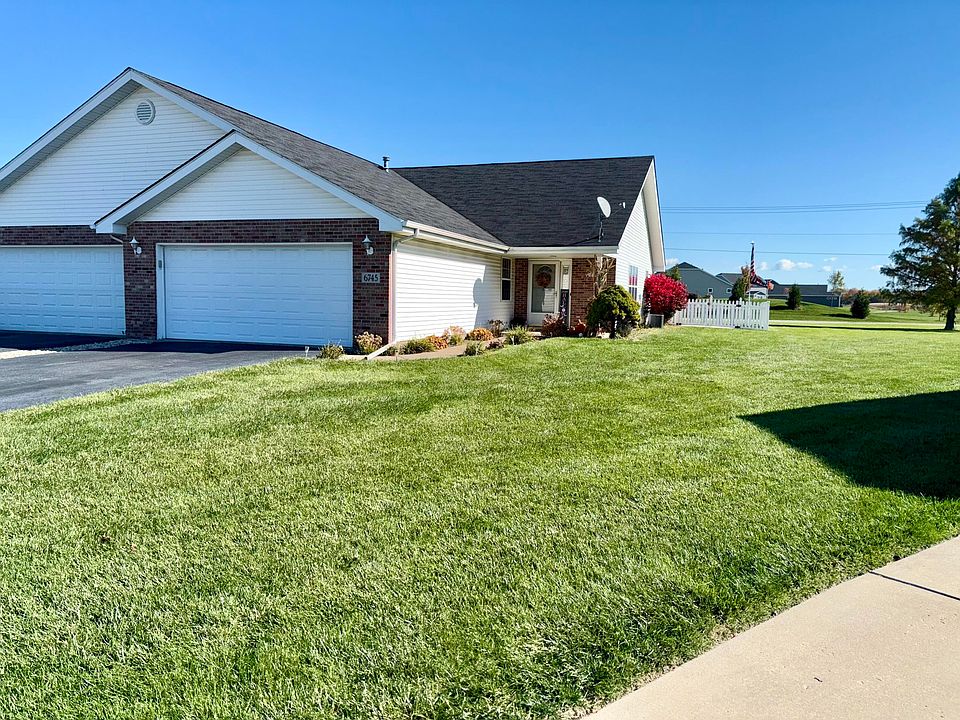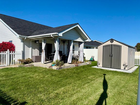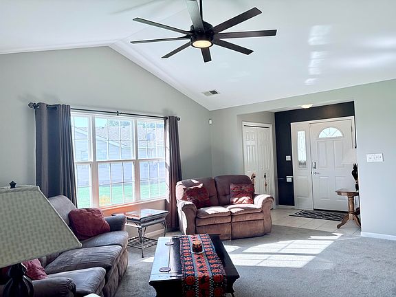 This beautiful 2-bedroom, 2-bath half duplex has been recently updated in 2023. This inviting single-level home features a charming, covered porch, perfect for enjoying your morning coffee or relaxing in the evening. The exterior offers great curb appeal, and the porch provides a welcoming entrance. Inside, the foyer leads into the spacious living room, featuring impressive, vaulted ceilings and a ceiling fan that adds both style and comfort. The interior showcases both carpet and vinyl flooring throughout, along with paint and modern light fixtures that enhance the home's appeal. The eat-in country kitchen is equipped with sleek Samsung appliances, a pantry for added storage, and a sliding door that opens to a covered patio, complete with a TV, curtains, and a ceiling fan for those outdoor activities. The main bedroom is a serene retreat, boasting a private bath and a generous walk-in closet. The second bedroom is thoughtfully located on the opposite side of the home, ensuring privacy for guests or family members. A convenient laundry room features Samsung washer and dryer plus a utility sink with easy access to a finished 2 1/2 car garage that includes a keypad entry for added security and pull-down stairs for attic storage. Outside, the property is nicely landscaped and situated on a corner lot, featuring a fenced backyard that includes a flagpole that illuminates at night and a storage shed. Enjoy the lovely walking trails in the neighborhood, along with the benefits of low taxes and NO ASSOCIATION FEES! This home truly offers a perfect blend of comfort, style, and convenience!