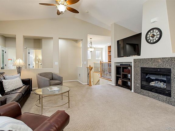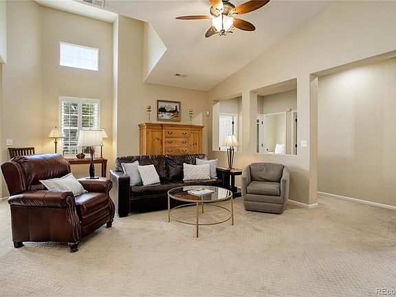 This charming 3-bedroom, 2-bathroom Saddle Rock condominium is a must see! This well-loved home has impeccable curb appeal and is located on carefully manicured grounds with access to a beautiful swimming pool, hot tub, clubhouse, and park. You will love the bright and airy open concept of the great room, kitchen and eating area, with vaulted ceilings and access to South-facing light. The kitchen boasts slab granite countertops and plenty of storage. The main balcony overlooks the swimming pool and can become a relaxing outdoor eating area. Also included are plantation shutters, a gas fireplace, a second balcony, and a tandem 2-car attached garage. The primary bedroom includes a dual vanity bathroom with granite and is separate from the other two bedrooms and bathroom. Don’t miss the perfect quiet home office, with built in bookshelves and workstation. Extremely close to shopping, restaurants, and trails, along with Saddle Rock Golf Course and Red Tailed Hawk Park. Located in Cherry Creek School District. Easy commute to the Denver Tech Center, DIA and RTD.