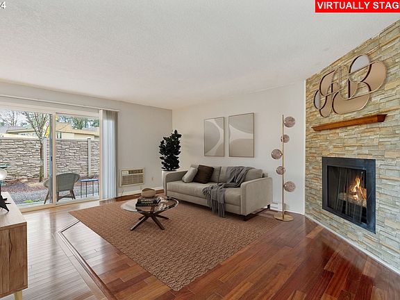 This sweet, updated and freshly painted condominium offers ease of living, all on the main level, no stairs! The gas fireplace sets the tone for comfort the moment you walk in the door. The efficient floor plan with entry area leads to the kitchen or living room with hardwood floors and bedrooms down the hall. The dining and living room have a slider to your patio area with storage. The primary bedroom is a suite with bathroom, double closets, laminate floor. Both bedrooms enjoy ceiling fans plus in unit laundry. This spacious kitchen has a newer refrigerator, dishwasher, stove/oven and microwave. The complex has a new roof, and paint within the past three years plus no rental cap but is 79% owner occupied! Relax in the outdoors by swimming pool, also sauna in community building plus easy access to the Fanno Creek Trail Greenway to enjoy walking or bike rides! Bike storage is by parking lot. Amazing proximity to Red Tail Golf Course, Washington Square Mall, 217, Highway 26, Garden Home, Trader Joe's & bus lines. Come view and see your new home!