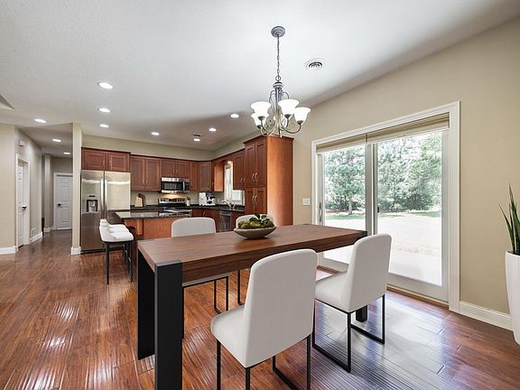 This welcoming 3-bedroom, 2-bath home with an office offers comfortable, one-level living on just under an acre. The spacious primary suite is a true retreat with a soaking tub, double sinks, and a tiled shower with glass door. The open-concept layout is filled with warmth and charm, featuring a living room with rich flooring, a tray ceiling with recessed lighting, and a cozy gas fireplace framed by custom built-ins. The kitchen is both stylish and functional with stainless steel appliances, abundant cabinetry, and a large center island. Just off the dining area, enjoy easy access to the backyard for effortless indoor-outdoor living. Main-floor laundry and thoughtful finishes throughout make this home as practical as it is inviting.