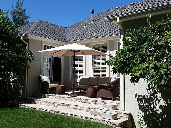 Perfectly maintained ranch style in prestigious neighborhood, lovely private back yard with flagstone walls, patio, and dining area, living room has solid birch hardwood floors, formal dining room, upgraded kitchen with cherry wood cabinetry and travertine marble floor, windows have plantation shutters, three car garage, unfinished basement and large crawl space. Perfect for that couple looking to downsize. Very low HOA fees. Golf community.