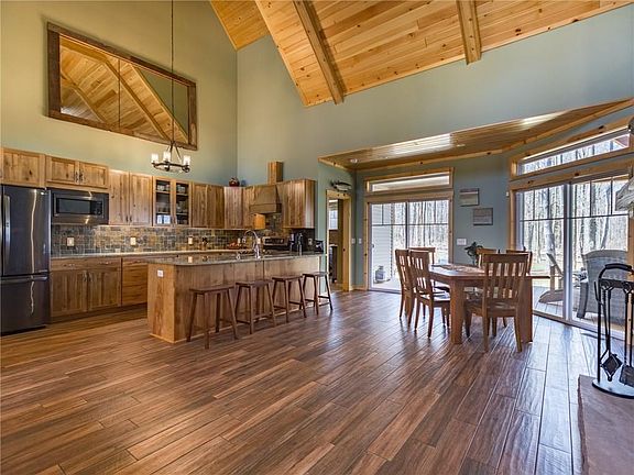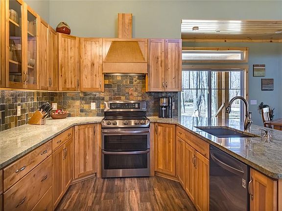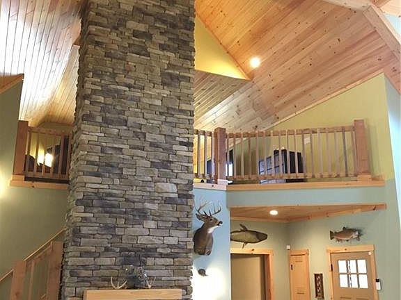 Custom built in 2017 on a wooded 5 acre lot with a half acre pond. Enjoy the outdoors from either your spacious front or rear covered porches. Custom features abound including natural birch cabinetry, granite counter tops, slate backsplash and LG appliances. Cedar beams and a stone floor to ceiling wood burning fireplace adorn the two story great room with knotty pine ceilings. The spacious loft area is a great place to relax and recharge your batteries. The fully finished basement level includes a second master bedroom suite with a full custom tiled bathroom. The lower level also includes a large wet bar, tv viewing area, fireplace and a gym room. All the appliances within the home are included and for an extra $25,000 you can buy this beautifully appointed home fully furnished.