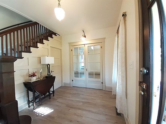 First Floor: Foyer with original stairway and french doors lead to open living room, dining room and kitchen;