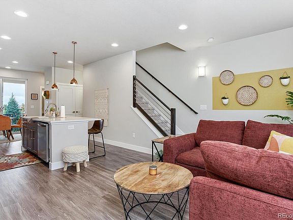 Pride of ownership prevails in this newer modern townhome/rowhome in Saddlerock with mountain views! Running throughout the main living area are low maintenance LVT Modern Farmhouse Cool floors! You will love the gourmet kitchen fully equipped with everything you need including a large center island with Newstone snow quartz countertops and counter space seating as well as oversized separate pantry. Beautiful copper pendant lighting hangs over the island, complimenting the custom handles throughout the kitchen & baths along with stainless appliances. When you don't want to eat at the bar, you have a separate dining space, overlooking the covered patio to the west. Walking out of the dining room you will find yourself on the cozy back patio to take in those westerly views. This is the perfect spot to relax with a glass of wine after a long day and watch the sun set behind those beautiful Rocky Mountains. Going to the opposite side of the townhome is the living room, with enough wall space to make it your home theater! A powder room completes the main floor. Upstairs, the luxurious brand new carpeting goes up the stairs, down the hall and to both bedrooms. The primary owner's suite includes en suite full bath with double sinks, beautiful quartz counters and a shower with a sitting area & custom tile. The second bedroom has its own private full bath with separate closet. The laundry closet with washer & dryer included is also on this floor so you never have to go far! The oversized 2 car tandem garage has a separate storage space area for all the extras. Don't wait, come and see this home today!
