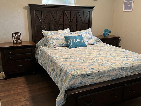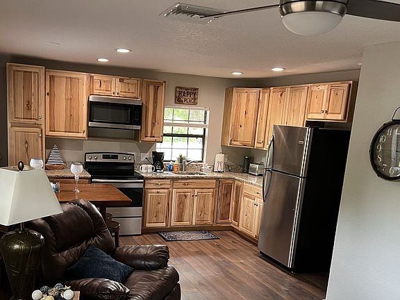 Beautiful two bedroom, one bath home with updated kitchen and bathroom. Plank flooring throughout. Central Heat and A/C. Side carport and front patio with table and umbrella. Firepit in side yard which sits adjacent to fishing pond. Fully furnished with leather electric reclining sofa, separate recliner, dining table and stools, Queen beds with matching furniture in each bedroom. Kitchen is fully equipped with pots/pans, dishes, silverware, etc. Plenty of pantry and cabinet space. Coin laundry on premises. 55+ preferred Tenant pays for electric monthly.