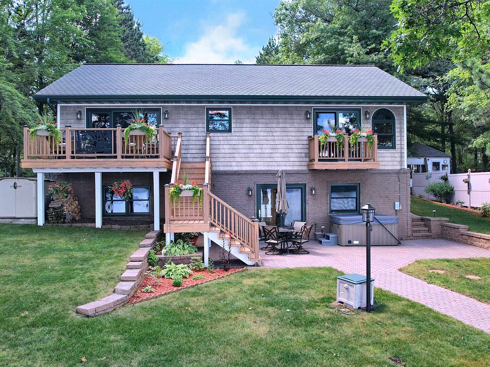 Custom-Built Home with Swimmable Frontage. Impeccably crafted, and located on sandy, swimmable Crystal Lake frontage with easy access. Top-quality materials throughout and a beautifully manicured exterior with concrete drive, patios & mature landscaping. Enjoy an open-concept main floor, lakeside decks, spacious kitchen with Hickory cabinetry, composite countertops, and generous workspace. The adjoining living & dining areas feature a cozy gas fireplace. The main-floor primary suite includes its own private balcony overlooking the water. The bright walk-out lower level includes a large family room with wet bar that walks out to patio and hotub, 2 bedrooms, a 3rd room perfect for a guest room, office, or workout space, bath w/shower, & storage room. A gentle slope leads to the shoreline, perfect for swimming and relaxing. Two oversized garages, one is heated & the other includes an upper-level storage area. Don’t miss your chance to own a truly exceptional waterfront home!