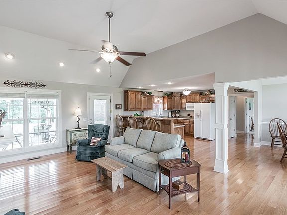 Welcome to complete serenity with this ONE level, all brick home! 1800+ S.F. with room for expansion space/bonus area, 3 BR's, 2 BA's, LR with gas fireplace, Kitchen has plenty of cabinet space, pantry and high top bar seating! Hardwoods flow through out living areas and hallway! Covered front/back porches! 60x30 shop has electric, water and lean to for extra open storage! Fiber-optic internet/cable!
