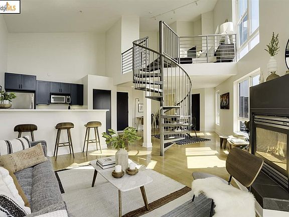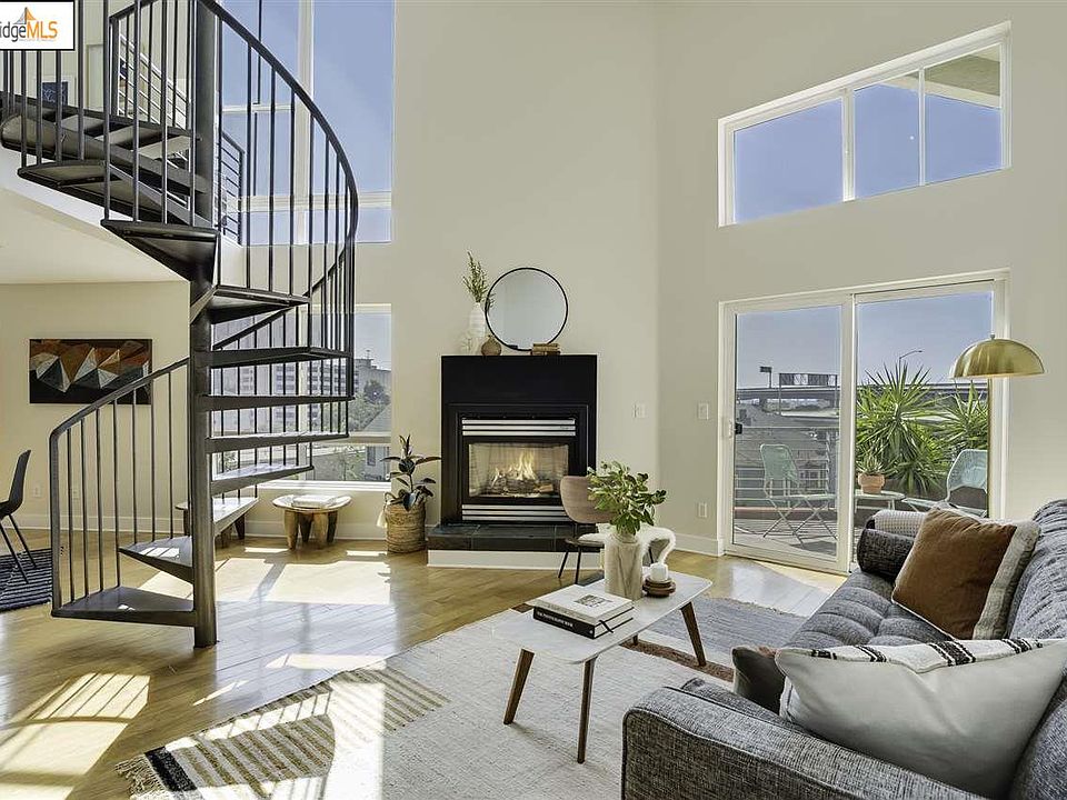 Sophisticated Downtown Oakland loft features a spacious, light filled floor plan for practical living in a comfortable work-from-home environment. The condo features 18 foot high ceilings, beautiful hardwood floors, a spiral staircase, and a terrace for al fresco entertaining. The recently updated open kitchen features new quartz countertops as well as stainless steel appliances. The living area is centered around a cozy fireplace and adjacent to a private balcony with electrical connections, water outlet, and drainage. The building has a secured garage with designated parking and additional storage. Highly walkable area with easy access to Downtown, Old Oakland, Jack London Square and Alameda. Nearby commuting options casual carpool, BART, and freeway access all just minutes away. Discover urban living at its finest!
