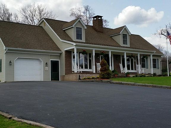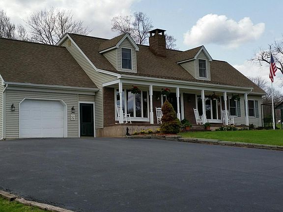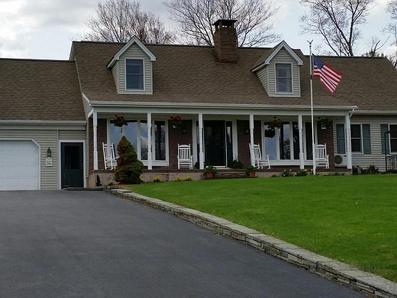 COUNTRY COMFORT- Enter the property through split rail fencing & follow the paved driveway to this beautiful, well-maintained Country Cape. The home, covered porch & patio overlook the 16' deep spring-fed private pond set against views of the Catskill foothills & 35 acres of fields & woodlands. The home features a country kitchen, living room w/fireplace, 3-5 bedrooms, 2 1/2 baths, full basement, and views from nearly every room. Master suite on 1st floor. Hardwood and ceramic tile flooring