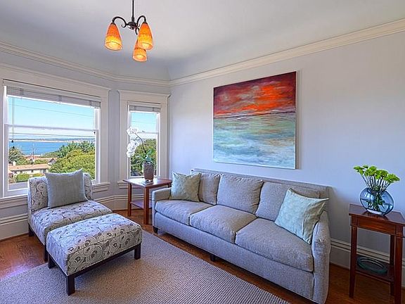 Monterey Majestic Victoria w/ big bay views out your front window! Remodeled from head to toe, this 5 bedroom 3.5 bath home offers the detailed quality one dreams of. Separate living quarters upstairs, gourmet kitchen, separate dining area, two fireplaces, hardwood floors and so much more. Charming, functional and updated all within a short distance to historic Cannery Row & the Monterey Aquarium.