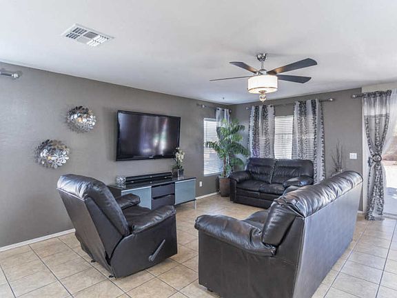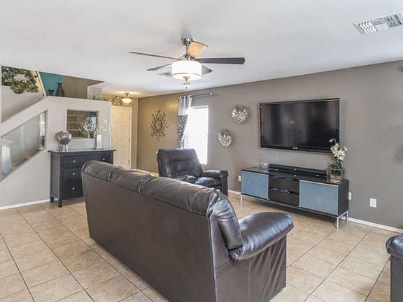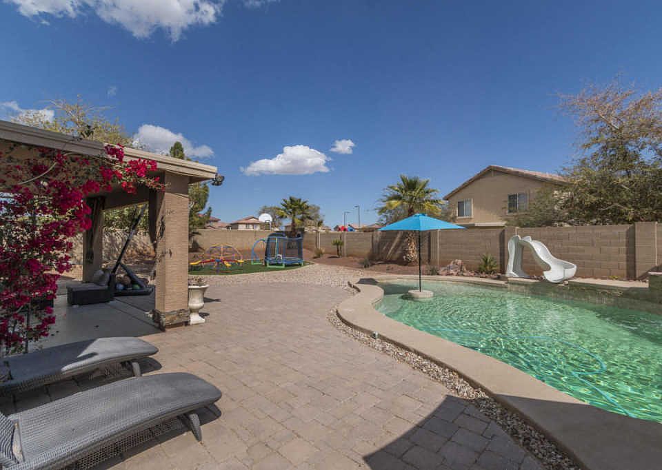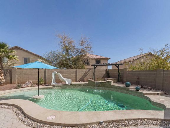 This spacious family homes sits on a large homesite and offers 5 bedrooms & 3 baths in 2267 SqFt with a great room floor plan + upstairs loft. The eat-in kitchen features espresso maple cabinetry, tile backsplash, stainless appliances & breakfast bar. Sliding doors lead out to the covered patio with ceiling fan & large backyard. You'll love the salt water pool with water feature & umbrella island table, outdoor fireplace with pergola & seating area, stacked stone bar island, additional paver patio, & artificial turf for kids & pets to play on. One bedroom & full bath downstairs, perfect for guests! The master & 3 secondary bedrooms are upstairs. The master has a full bath with double sinks, tub/shower combo & walk-in closet. Upstairs bath also has double sinks & one bedroom has a walk-in* closet. Other features: 2 car garage with epoxy floors, cabinets, utility sink & service door, RV gate, upper/lower cabinets with folding area in main floor laundry room, stone accents on exterior & much more! See this home today!