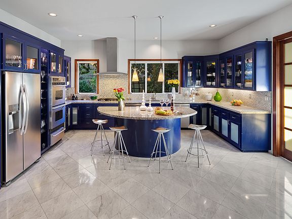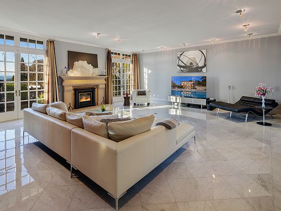 Inside, the home features a bright, open living area filled with natural light. Large windows and a contemporary fireplace create a comfortable main gathering space, while multiple seating areas allow for both everyday living and entertaining. The kitchen is thoughtfully designed with high-end appliances, modern finishes, and ample counter space, providing a functional layout for daily meals and hosting.