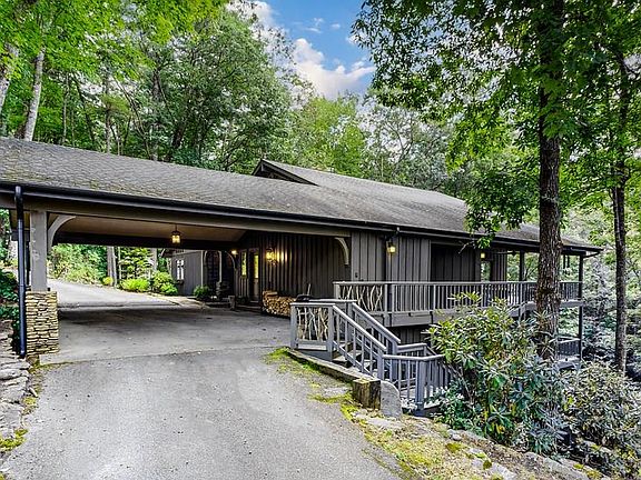 Paradise found! This stunning mountain contemporary home offers a picturesque blend of mountain and river views, nestled within a secure gated community between the charming towns of Highlands and Cashiers. With ceilings that reach for the sky and walls of glass, living here feels like living in a tree house! Step onto the expansive outdoor decks, where you can listen to the soothing sounds of the river. Imagine waking up to the sweet river melodies or unwinding on the covered deck while the birds sing and the river dances by. Inside, the kitchen is a chef's dream, marrying aesthetics with functionality. Its spacious island and cozy window seat make it the heart of the home. The great room boasts wood ceilings and gleaming wood floors, complemented by a corner fireplace. The master suite is a retreat in itself, opening to a covered deck and featuring a renovated master bath with a freestanding soaking tub, a tile shower, and walk-in closets. Two en suite bedrooms with vaulted wood ceilings offer guests their own haven and deck access. Ascend the open staircase to discover a spacious loft, perfect for a home office, a pool table, or a play area for children. The terrace level brings even more amenities, including a large family room, a wet bar, two bonus rooms, and a workshop. It could easily transform into the perfect wine cellar for wine enthusiasts. Meticulously maintained and featuring an encapsulated crawl space, this home is in impeccable condition. The landscaped grounds include a trail leading to the river and a spot ready for a cozy fire pit. This extraordinary riverfront home, now available for the first time, won't be on the market for long. Your dream mountain retreat awaits!