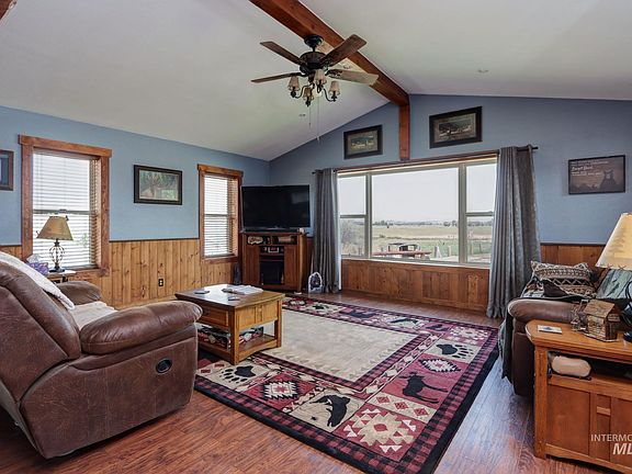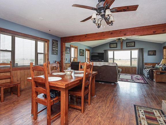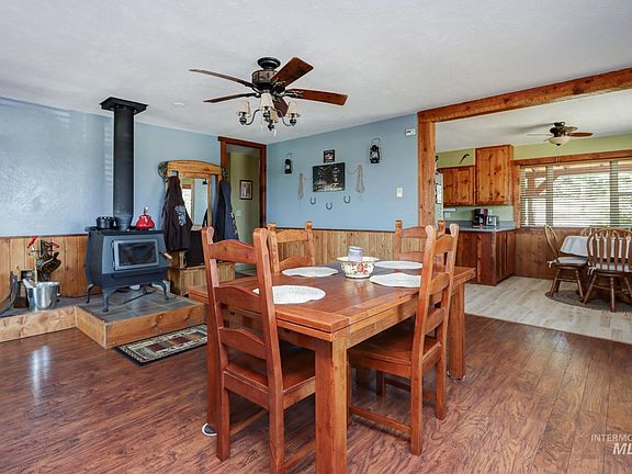 Beautifully updated home w/spectacular mountain views! Home has front & back porches to enjoy the sunrises & sunsets. Sits on almost 1 acre featuring numerous outbuildings, hitching post, fenced in raised garden area w/several fruit trees & berries, RV parking & RV dump w/water hook-up, pump for irrigation, & it's also nicely secluded once you pass the neighboring property. Interior of home is warm & cozy. It features newly updated flooring, wood wainscot accent walls, wood beam, wood stove, open living/formal dining room & the most awesome views from the east windows showcasing the Butte, Valley & Bogus Basin! Kitchen has a dining nook area, custom cabinets, stainless steel/black appliances, beautiful corian countertops, & a pantry. Master is spacious w/attached office/nursery/work-out room, & a full wall of closets. Master bath has tub/shower, marble surround, linen closet & a sauna. There are ceiling fans throughout home. New roof & ductless/mini split installed in 2023. Has two hot water tanks. NO HOA's