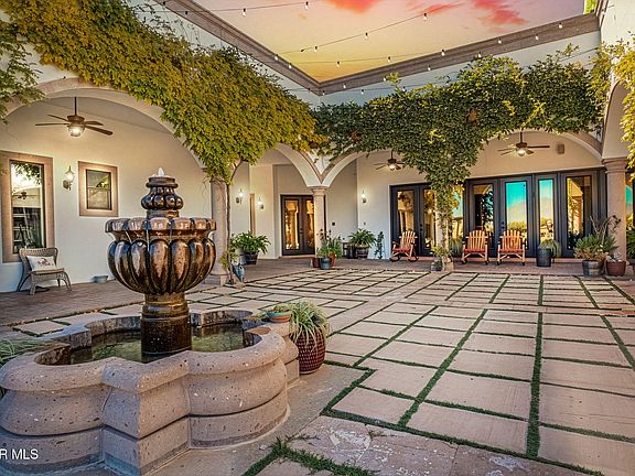 Outdoor living is equally impressive. The hacienda-style terrace features a central fountain framed by wisteria-covered pergolas, creating a peaceful retreat for morning coffee or evening wine while enjoying breathtaking views of the color-changing Franklin Mountains.