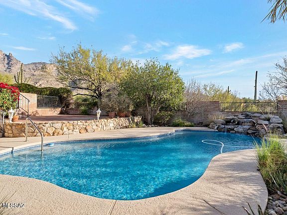 Nestled in the tranquil Coronado Foothills, this classic burnt adobe home offers serene desert living with a private shaded porch/view patio for dining & entertaining and lush yard encircling a sparking pool and waterfall. Enjoy stunning Catalina Mountain views from the comfort of your lovely yard. Features include a cozy fireplace in the living area. built-in murphy bed in one of the bedrooms, and a spacious walk-in closet with custom shelving in the primary suite. Freshly painted with no carpet, this home has a 15 SEER 5-ton HVAC system plus ample guest parking. Extra den/possible office off the kitchen, breakfast nook, and a separate laundry room with sink complete this charming foothills home. Near shopping, trails and Catalina Foothills HS.