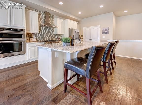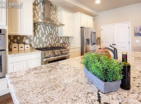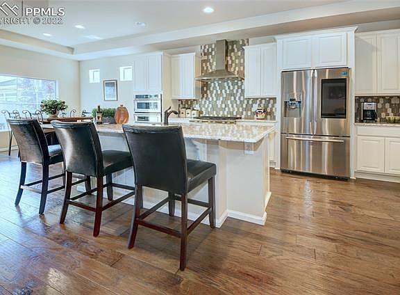 You must tour this stunning 4 bedroom 3 bath ranch style patio home in the beautiful Banning Lewis neighborhood. Located just a short walk from Banning Lewis Ranch schools, parks, pools, fitness center, dog parks, and more. This Oakwood home features granite countertops, Kitchenaid gas range and double ovens, Kitchenaid dishwasher, microwave, convection oven, Samsung smart fridge with screen, custom backsplash, a large kitchen island, gas fireplace, hardwood floors, separate dining, covered rear patio, the spacious hot tub and firepit stay, large family, enormous 4th bedroom in the basement, large storage room, and of course air conditioning.