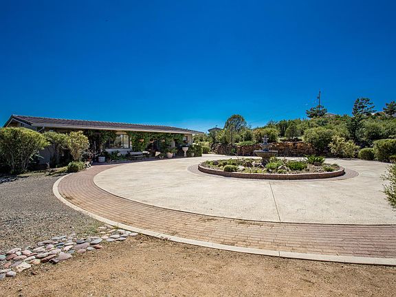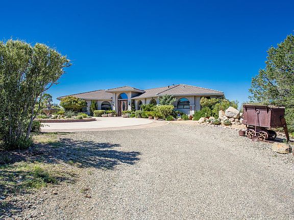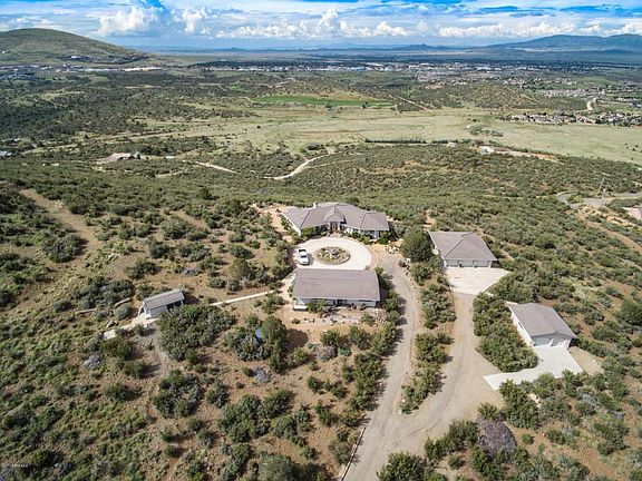 Located on a hill high above the Stoneridge Golf Course, this 10 acre estate offers endless panoramic views of Granite Mountain, Bill Williams Mountains, Mingus Mountain, city lights, and close proximity to Prescott National Forest open space. The home is designed to take advantage of the views with a curved wall of windows in the living room along with generous window space in the master suite, kitchen, and informal dining room. A gourmet island provides lots of workspace with built-in refrigerator, double ovens, and walk-in pantry. The bonus room off the kitchen offers a private space for an in home office or crafts. The guest house is located across the circular driveway, which includes a kitchen, bathroom, living room, bedroom areas with a private patio with mountain views to the